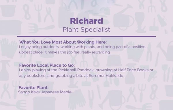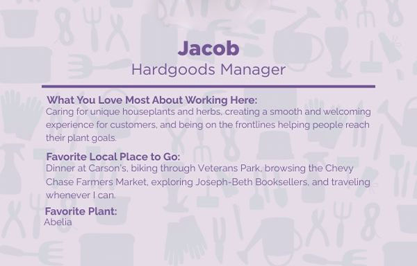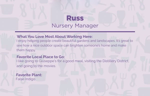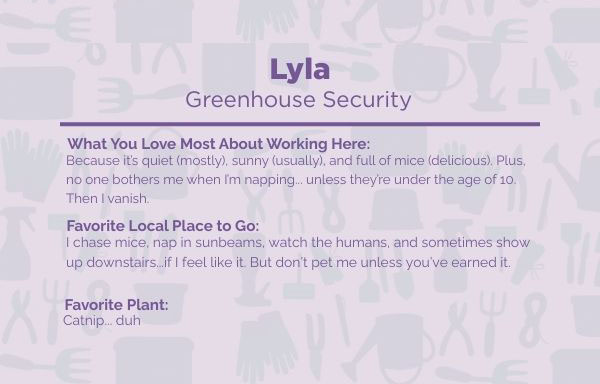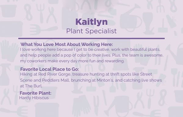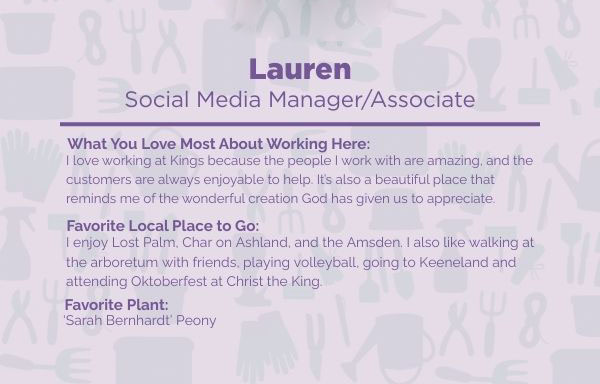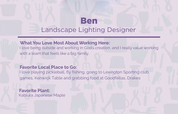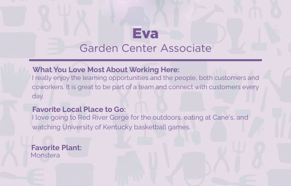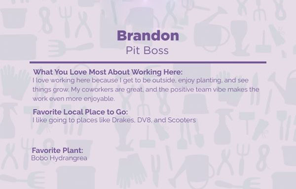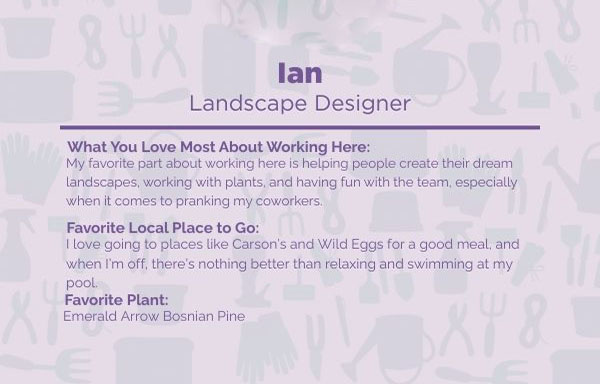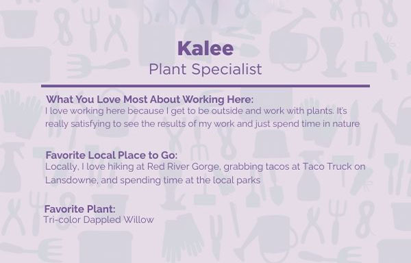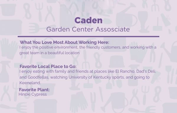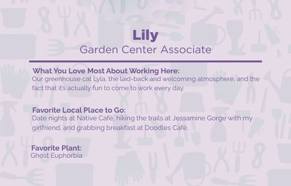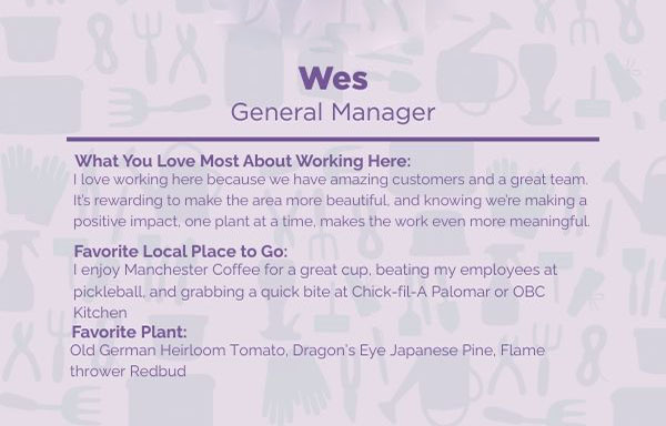 Meet Our Staff Your Garden Coaches: Wes General Manager Russ Nursery Manager Jacob Hardgoods Manager Ian Landscape Designer Ben Landscape Lighting Designer Kaitlyn Plant Specialist Kalee Plant Specialist Richard Plant Specialist Lily Garden Center Associate Caden Garden Center Associate Eva Garden Center Associate Brandon Pit Boss Lauren Social Media Manager/Associate Lyla Greenhouse Security